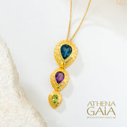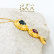 This Cosmos Triple Pendant Necklace is crafted from 18k Gold with London Blue Topaz, Tourmaline, and Peridot teardrop stones. This beautiful pendant showcases the classic Greek "tortoise shell" design, and is available in your choice metal color. A striking pendant necklace that offers a refined touch of sophistication to elevate any outfit, including every day. The necklace portion will be custom made to your desired length.