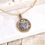 View full detailsThis striking large Phaistos Disc Pendant is crafted from solid 14k Gold, and showcases the enigmatic Phaistos Disc on both sides of each of the re...