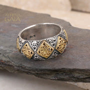 Byzantine Checker Wide Ring - 18k Gold & Sterling Silver Ring - Cigar Band Ring