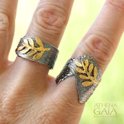 This listing is for a Champion Olive Branch Band Ring in the sizes listed. This ring beautifully captures the Greek tradition of honoring the importance of the olive, and features a solid 14k Gold olive branch set on a textured 925 Sterling Silver band.