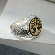 Golden Tree of Life Ring - 18k Gold & Sterling Silver Ring - Signet Ring