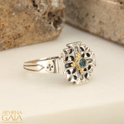 This Pop Rocks Soft Square Crown Ring is crafted from 925 Sterling Silver with a Quartz Doublet of your choice and an intricate "crown" of 18k Gold...