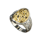 This Meadow Shadows Wide Band Oval Ring features an intricate 18k Gold filigree design, with 925 Sterling Silver. This unisex ring is a blend of timeless artistry and refined sophistication, perfect for adding a subtle yet striking touch to any ensemble. This ring has a comfortable tapered back, making it ideal for everyday wear.