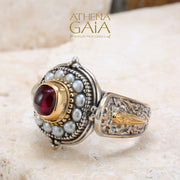 This Pearl Fountain Soft Square Ring is crafted from 18k Gold and Sterling Silver with Pearls surrounding a center Garnet. It's a classic design, with a comfortable tapered back, that adds a touch of simple elegance to any outfit.