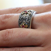 Triple Cross Eastern Ruby Ring 18k Gold & Sterling Silver Ring - Cigar Band Ring