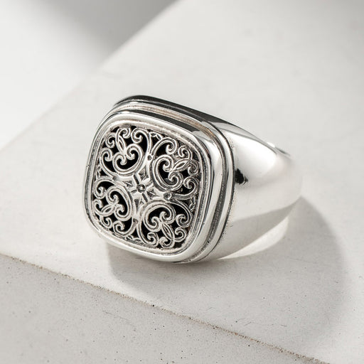 GerochristoThis Simplicity Square Ring is crafted from 925 Sterling Silver. It features an intricate filigree pattern with a comfortable tapered back, making ...