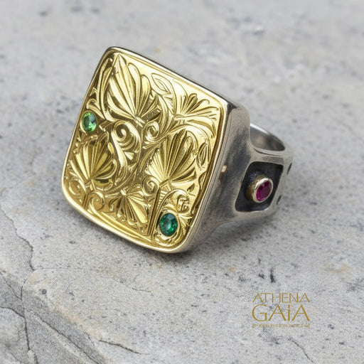 Hand-Etched Anthemion Square Ring - 18k Gold & Sterling Silver Ring - Signet Ring
