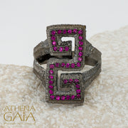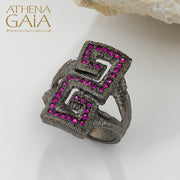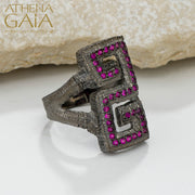 Make a striking impression with the Long Meander Stone Ring, crafted in your choice of oxidized (shown), yellow, rose, or white 18k gold. Featuring a bold Greek key design, this cocktail ring blends timeless elegance with a touch of modern sophistication, perfect for elevating any ensemble.