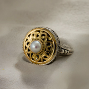 Garden Shadows Round with Pearl Ring - 18k Gold & Sterling Silver Ring - Cocktail Ring