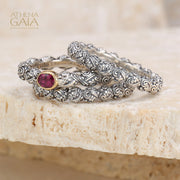 Wild Flowers Edged band Ring (on model, center with 2 Single Oval Stone Rings)
