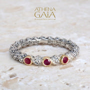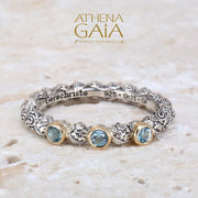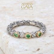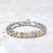 This Meadow Breeze Triple Round Stone Stackable Ring features a 925 Sterling Silver high-detail band and 3 gemstones with 18k Gold bezels. This ring is perfect to wear alone on a pointer or pinky finger, and equally lovely when stacked with other accent rings. The ring has detail all around so it can not be resized without interrupting the 360 degree pattern.