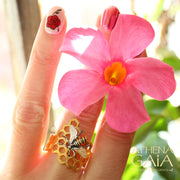 A honeycomb ring with a bee at the center of it all.