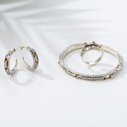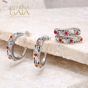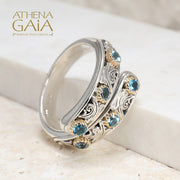 This Nefeli Wrap Ring is a beautiful ring that features Gemstones of your choice set in 18k Gold, and surrounded by swirls of 925 Sterling Silver detail. It can be comfortably worn stacked with another of your favorite rings, but is equally perfect when worn alone.