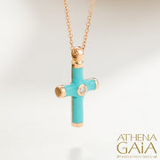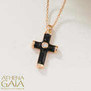 Our 18k Gold Enamel Cross allows you to mix and match white, rose, or yellow gold with the enamel color of your choice. Decorated with a sparkling center diamond, this charming cross makes a sweet baptism gift or a colorful way to keep your faith close every day.