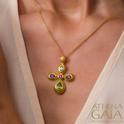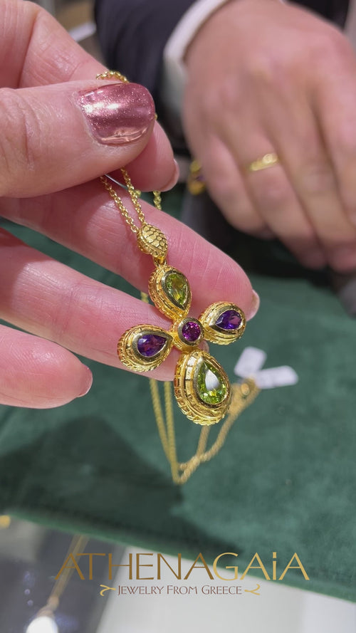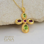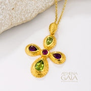 This beautifully crafted Cosmos Byzantine Cross is available in 18k yellow, white, or rose colored gold, adorned with a variety of colorful stones. Perfect as a baptism cross or as a decorative piece for special events.