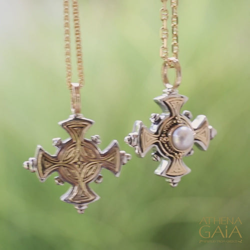 The Etched Maltese Cross is crafted from 18k gold and sterling silver. Perfect for baptisms, special events, or daily wear, it's a symbol of elegance and sophistication.