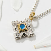 This expertly crafted Rustic Center Stone Silver Cross, features a beautiful combination of 18k Gold and Sterling Silver with a center gemstone of your choice. It's perfect for baptisms, special events, or daily wear and adds a touch of elegance to any outfit.
