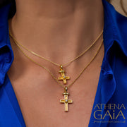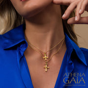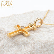 A Latin cross that blends simple modern Greek style with a sparkling twist. Crafted in 18k gold, its elegant center diamond catches the light beautifully, making it a playful yet timeless symbol of faith. Perfect for adding a touch of shine to your everyday look or special occasions.