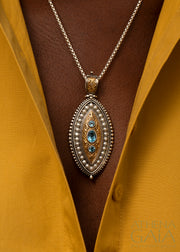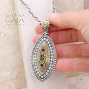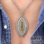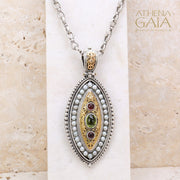 This stunning Thalassia Ellipse Pearl Framed Pendant combines elegance, with classic Greek symbolism. It's crafted from 18k Gold and 925 Sterling Silver with a border of Pearls, three center Gemstones of your choice, and a Diamond on the bale. It's a true statement piece! The bale opens for easy mounting on most chain styles.