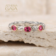 This Meadow Breeze Triple Oval Stone Ring features a 925 Sterling Silver high-detail band and 3 oval gemstones with 18k Gold bezels. This ring is a lovely worn alone on a pointer or pinky finger, but also beautiful worn as a stacked set. It has detail all around, and can not be resized without interrupting the 360 degree pattern.
