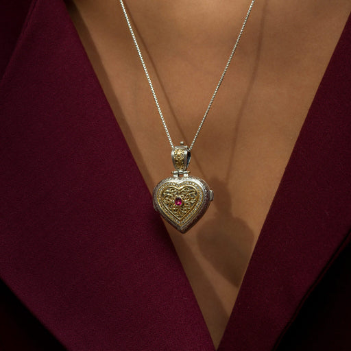 This Kosmos Heart Locket features an intricate 18k Gold filigree pattern with 925 Sterling Silver. The filigree is surrounded by either Brown Diamo...