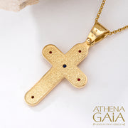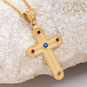 Designed with elements of byzantine design, this 14k gold Western Pomme Cross features a delicate rope border and accents of sapphires and rubies. Perfect for everyday wear or as a meaningful baptism cross. Available in yellow, white, or rose gold.