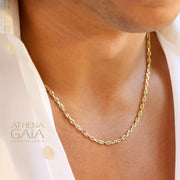 This is a great traditional unisex chain that's perfect for layering, or holding pendants. Shown in the hand photo with the other chains is a 3.0mm width. The man is wearing a 3.0mm width. The woman is wearing the 4.2mm in 15 inches length. The white gold shown is 2.3mm width.