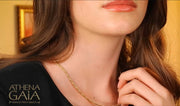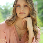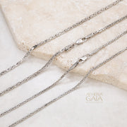 Shown here is the 1.8mm 14k Yellow Gold option. (The White Gold chain shown is only available in 1.8mm width.) The photo of the model shows her wearing it layered at 16 inches, above a Gold Rolo Chain and cross.