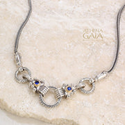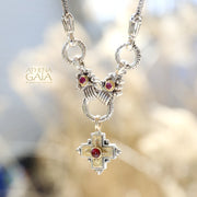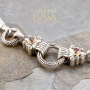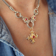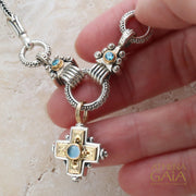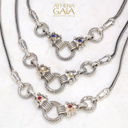 Although this necklace can be worn by itself (that was it's original intent) it uses the loop of a charm bracelet in the center and therefore becomes the perfect way to give your smaller pendants more presence. All three loops open to accommodate a pendant (see video below for how to open the loops). The stone choices can match up with your favorite Gerochristo pieces to "extend" them into larger more ornate expressions.