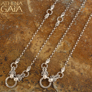 The construction of this chain includes a 4mm rolo chain with an opening center loop, anchored by two anthemion and circles. The center loop has a hinged opening that allows for pendants to easily, and securely, be snapped in.