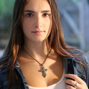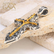 This refined cross pendant showcases a solid 18k Gold Latin Cross face design at its center, elegantly mounted on a 925 Sterling Silver base. Designed with a unisex appeal, this cross adds a touch of elegance and sophistication to any outfit, making it perfect for baptisms, special events, or even daily wear. This cross is also available with a plated 18k Gold center design, here.