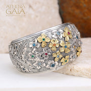 This Two-Toned Flower Field Cuff Bracelet is a beautiful statement piece, with a wide and high-detailed presence. Crafted from 925 Sterling Silver and 18k Gold, with mixed gemstones. The cuff is one size, and fits the average 6-8 inch wrist.