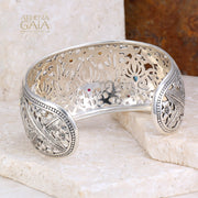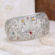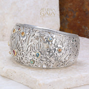 This Wild Flowers Gold Bezel Cuff Bracelet is a beautiful statement piece, with a wide and high-detailed presence. Crafted from 925 Sterling Silver with mixed gemstones, each with an 18k bezel. The cuff is one size, and fits the average 6-8 inch wrist.