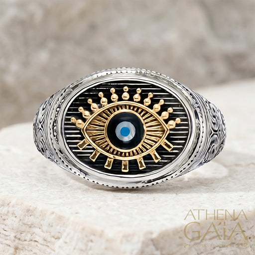 GerochristoCrafted from solid 925 Sterling Silver and 18k Gold, this wide band Oval Evil Eye Signet Ring boldly serves as a powerful shield against negative e...