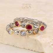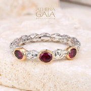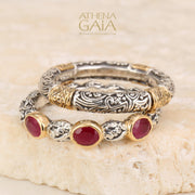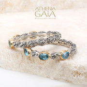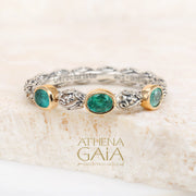 This Meadow Breeze Triple Oval Stone Ring features a 925 Sterling Silver high-detail band and 3 oval gemstones with 18k Gold bezels. This ring is a lovely worn alone on a pointer or pinky finger, but also beautiful worn as a stacked set. It has detail all around, and can not be resized without interrupting the 360 degree pattern.