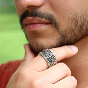 A unisex ring with a highly detailed presence. The unadorned sizing bar on the back allows for easy sizing at a later date.
