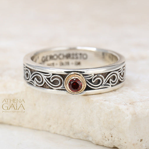 GerochristoThis simple yet classically elegant Kyma Round Bezel Band Ring is crafted from 925 Sterling Silver, with a Garnet or Blue Topaz set in an 18k Gold ...