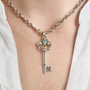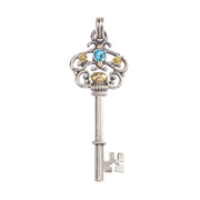 Unlock a world of possibility with this charming Byzantine Key Pendant. Crafted from 18k Gold and Sterling Silver, with a sparkling Aqua Spinel and large bale to accommodate most chain styles, this classic pendant will never go out of style.