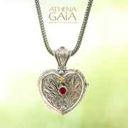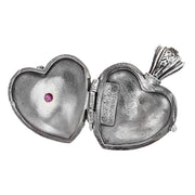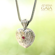 This charming Mini Heart Locket Pendant is sure to make your heart smile. Crafted from 925 Sterling Silver with 18k Gold details and two Rubies. It is the smallest of the 3 hearts shown in the comparison photo.