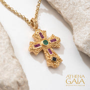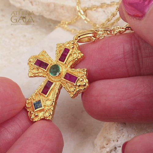 One side of the cross has Emeralds and a 0.08ct Diamond center. The other side has Rubies, an Emerald, and a blue Sapphire, all totaling approximately 1.10ct.
