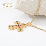 This Byzantine style Orthodox cross embodies classic elegance and timeless sophistication. Featuring Rubies, Sapphires and a center Emerald, it's a...