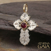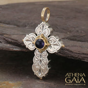 Rustic Center Stone Orthodox Cross- 18k Gold and Sterling Silver - Cross Necklace