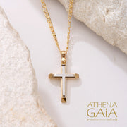 Crafted with precision and expertly designed, our Two-Toned Beveled Latin Cross is made from high-quality 14k gold, featuring a unique combination of yellow and white tones. Ideal for baptisms, special events, or daily wear, this cross adds a touch of elegance and meaning to any outfit.