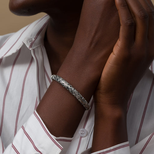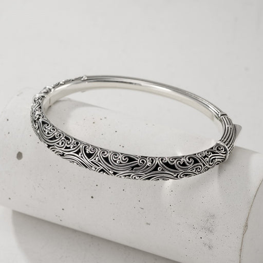 Easy opening hinged bracelet — perfect for everyday wear. This bracelet boasts an intricate design that adds a touch of elegance to any outfit. Sol...