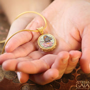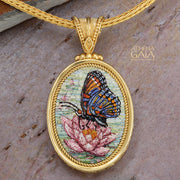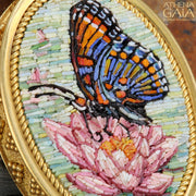 This is a one-of-a-kind piece produced by Luigina Rech and Giorgo Damaskos, for Athena Gaia. The butterfly, representative of Artemis, is an intricately crafted micro mosaic, set in 18k Gold.