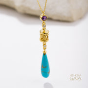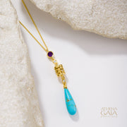 A luminous turquoise stone commands attention, framed by rich amethyst and two brilliant diamonds set in 18k gold. This daring piece refuses to whisper—it demands to be seen. Perfect for those who wear their confidence as boldly as they wear their jewelry, this necklace transforms any moment into a statement.