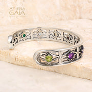 This Stone and Leaf Bracelet is a beautiful and high-detailed cuff crafted from Sterling Silver, with 9 mixed gemstones. The bracelet is one size, and fits the average 6-8 inch wrist.
