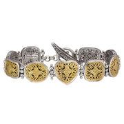 Meet your newest obsession. This Mediterranean Multi-Shaped Link beauty is equal parts elegant and effortlessly cool. Crafted from 18k Gold and Sterling Silver, this multi-shaped link bracelet features classic filigree detailing connected by flexible, comfortable links that move with you. The secure toggle closure keeps it exactly where it belongs. Dress it down for everyday sparkle or layer it up for those moments when you want to turn heads.