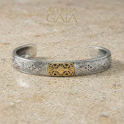 This Mediterranean Open Cuff Bracelet is a beautiful unisex statement piece. Crafted from solid 18k Gold and Sterling Silver, it features a high-detailed face and delicately etched easy to wear band. The cuff is one size, and fits the average 6-8 inch wrist.