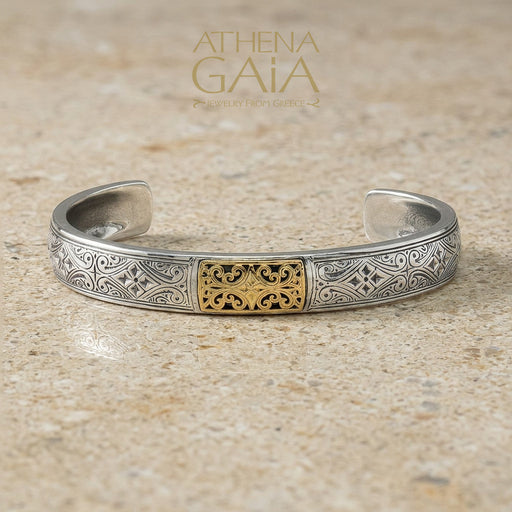 GerochristoThis Mediterranean Open Cuff Bracelet is a beautiful unisex statement piece. Crafted from solid 18k Gold and Sterling Silver, it features a high-de...